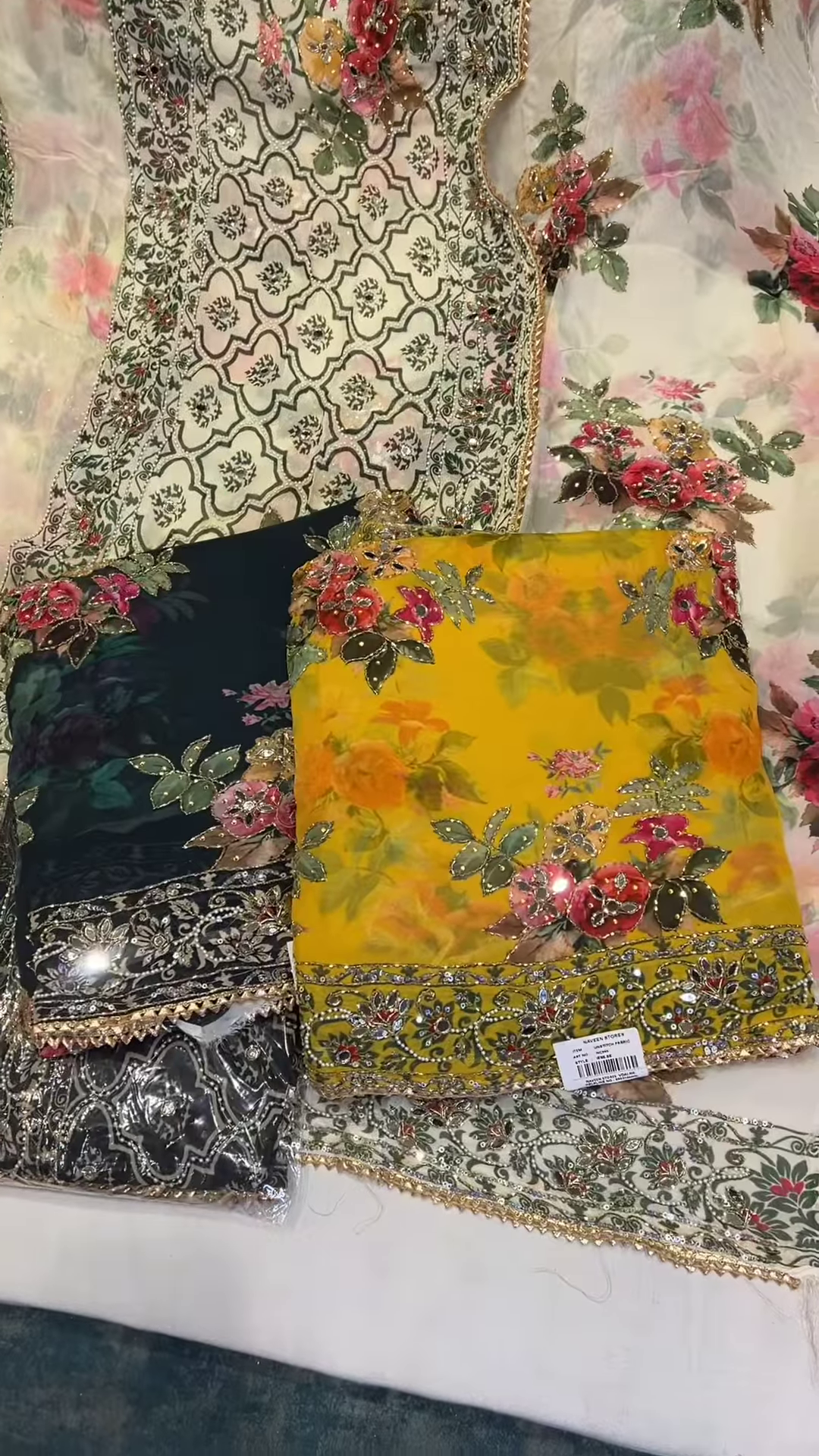 Set Includes: 1 heavily embroidered Kameez, 1 matching Dupatta, and 1 pair of tailored Salwar trousers.