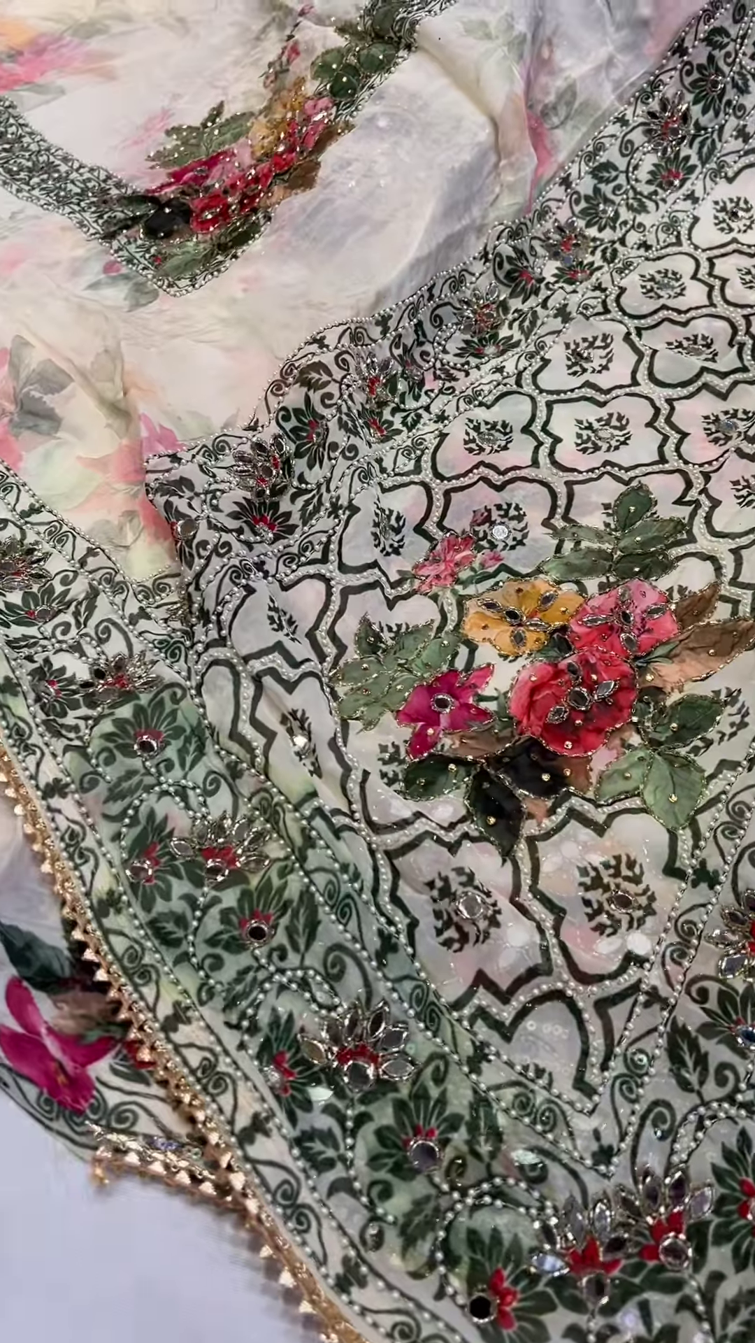 The Dupatta (Scarf): A true statement piece, the wide silk dupatta features matching scalloped embroidery along all four borders. The generous length allows for versatile styling—drape it over one shoulder for a classic look or across both arms for a more formal, majestic appearance.