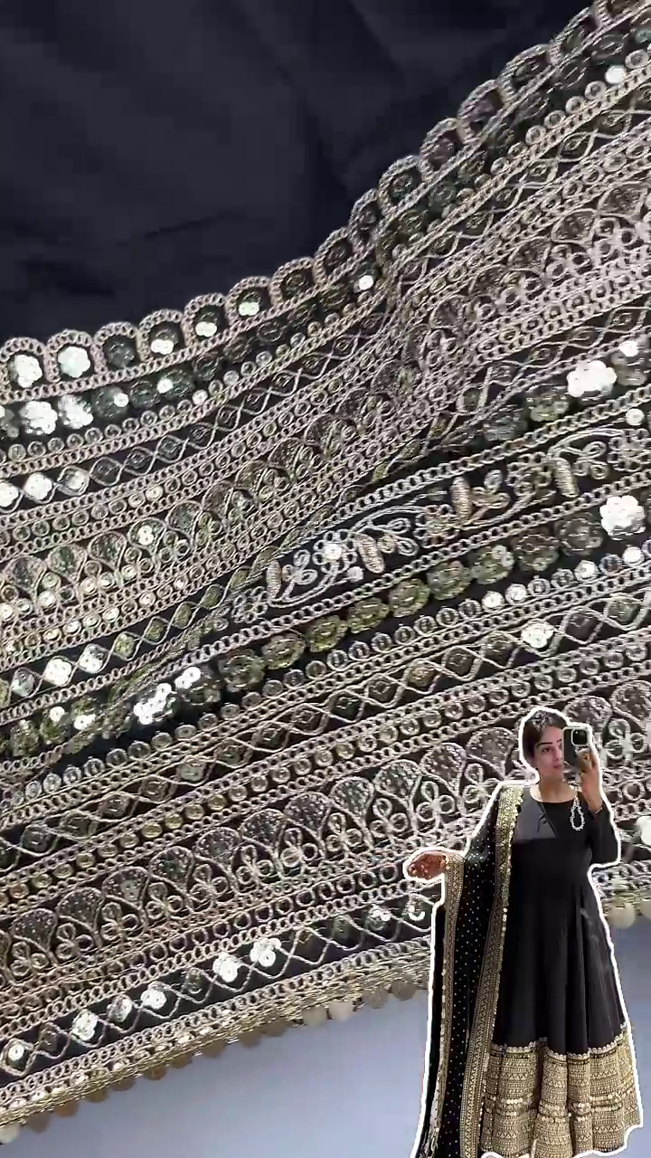 Feature Details Type Premium Designer Heavy Border Anarkali Set Work Type Concentrated Golden Zari • Sequin Jaal • Scalloped Edging Color Midnight Black with Antique Gold and Silver Accents Silhouette Full-Length Flared Anarkali Fabric Premium High-Grade Festive Fabric with Soft Lining Dupatta Coordinated Black with Heavy Ornate Borders