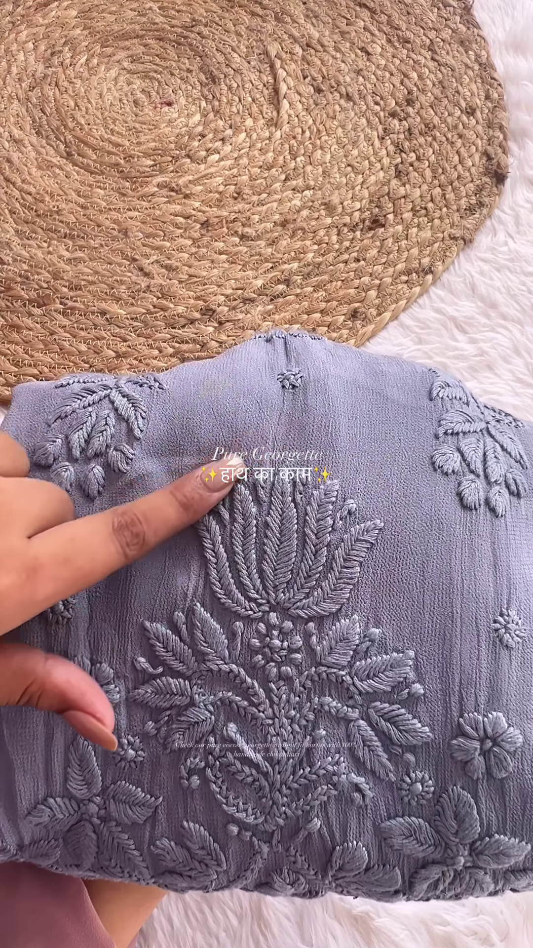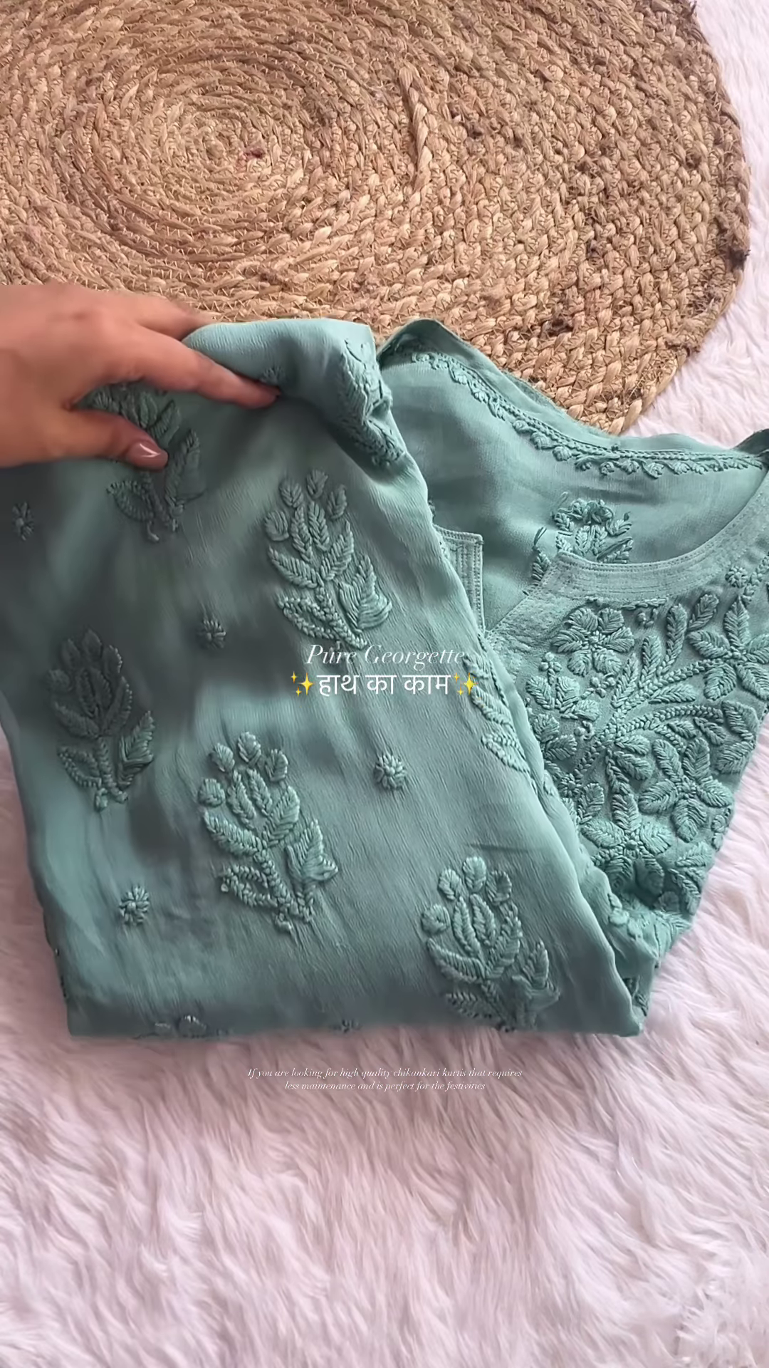 The kurtas feature an all-over “Jaal” (network) pattern of traditional Chikankari, meticulously executed by master artisans. The embroidery utilizes a variety of classic stitches, including “Phanda” (millet-shaped stitches) and “Murri” (rice-shaped stitches), which create a raised, multidimensional texture that you can feel. Every flower, leaf, and delicate vine is hand-stitched with absolute precision, showcasing a level of detail that machine-made garments simply cannot replicate. The neckline and central bodice are the focal points, featuring even denser embroidery that frames the face beautifully and adds a formal touch to the tunic.