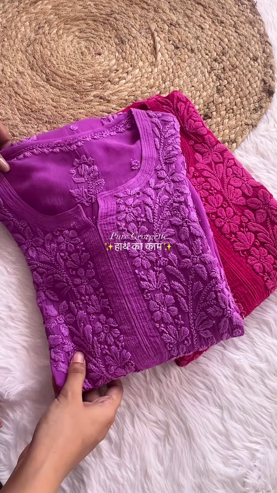 Immerse yourself in the world-renowned artistry of Lucknow with these breathtaking pure georgette Chikankari kurtas. Available in two regal jewel tones—deep fuchsia pink and majestic royal purple—these garments represent the pinnacle of Indian hand-embroidery. The fabric used is premium, high-density pure georgette, a material celebrated for its ethereal transparency, lightweight feel, and a fluid drape that creates a feminine and graceful silhouette. Georgette is the perfect canvas for heavy needlework because it remains breathable and soft against the skin even when covered in dense thread patterns.