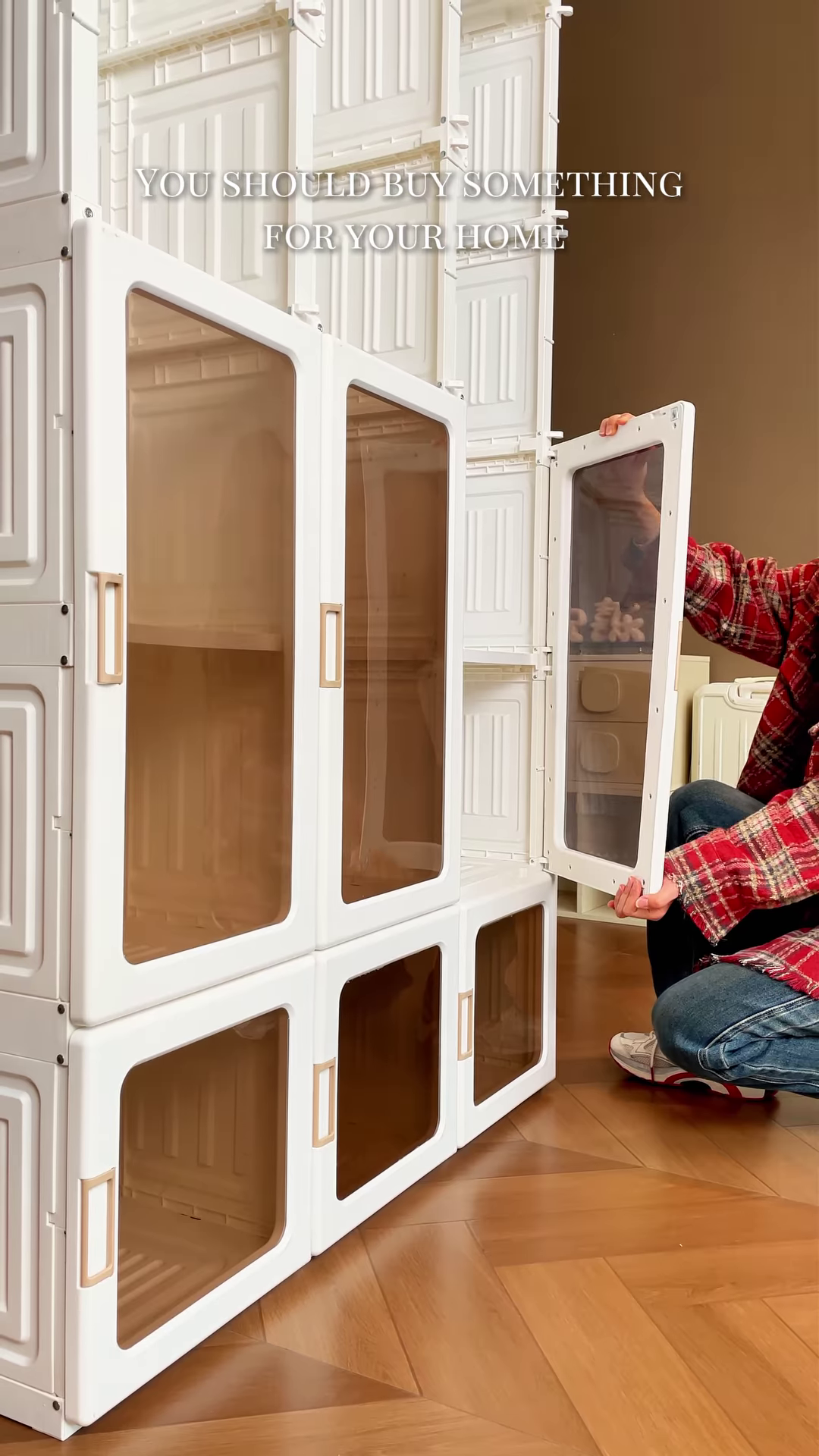 The cabinet features a grid of spacious compartments, each protected by a transparent, amber-tinted door. This design allows you to see exactly what is inside each section—be it clothing, handbags, shoes, or household linens—while still keeping the contents protected from dust and moisture. The tinted doors add a touch of sophisticated warmth to the white frame, allowing the unit to blend seamlessly into contemporary interior decors. Each door is equipped with a magnetic closure and an ergonomic, integrated handle for effortless access.