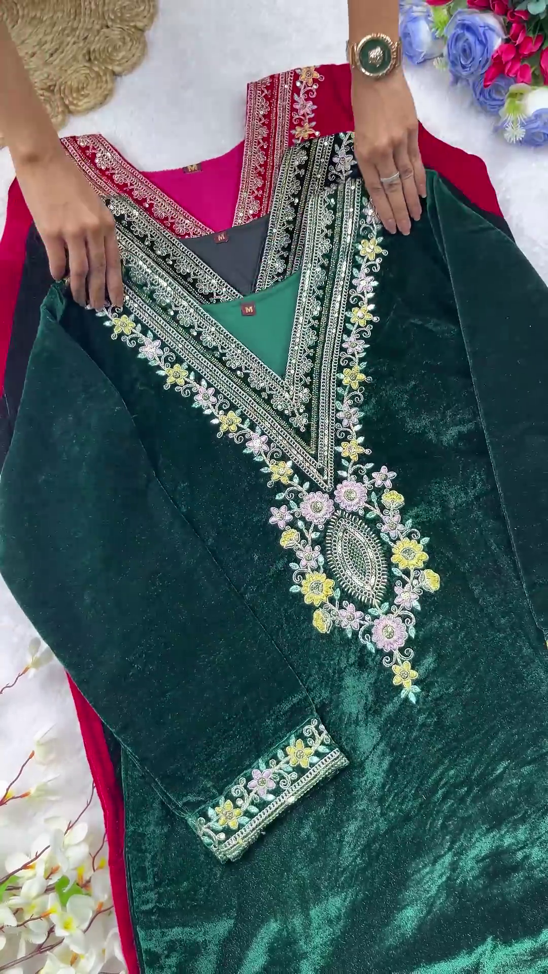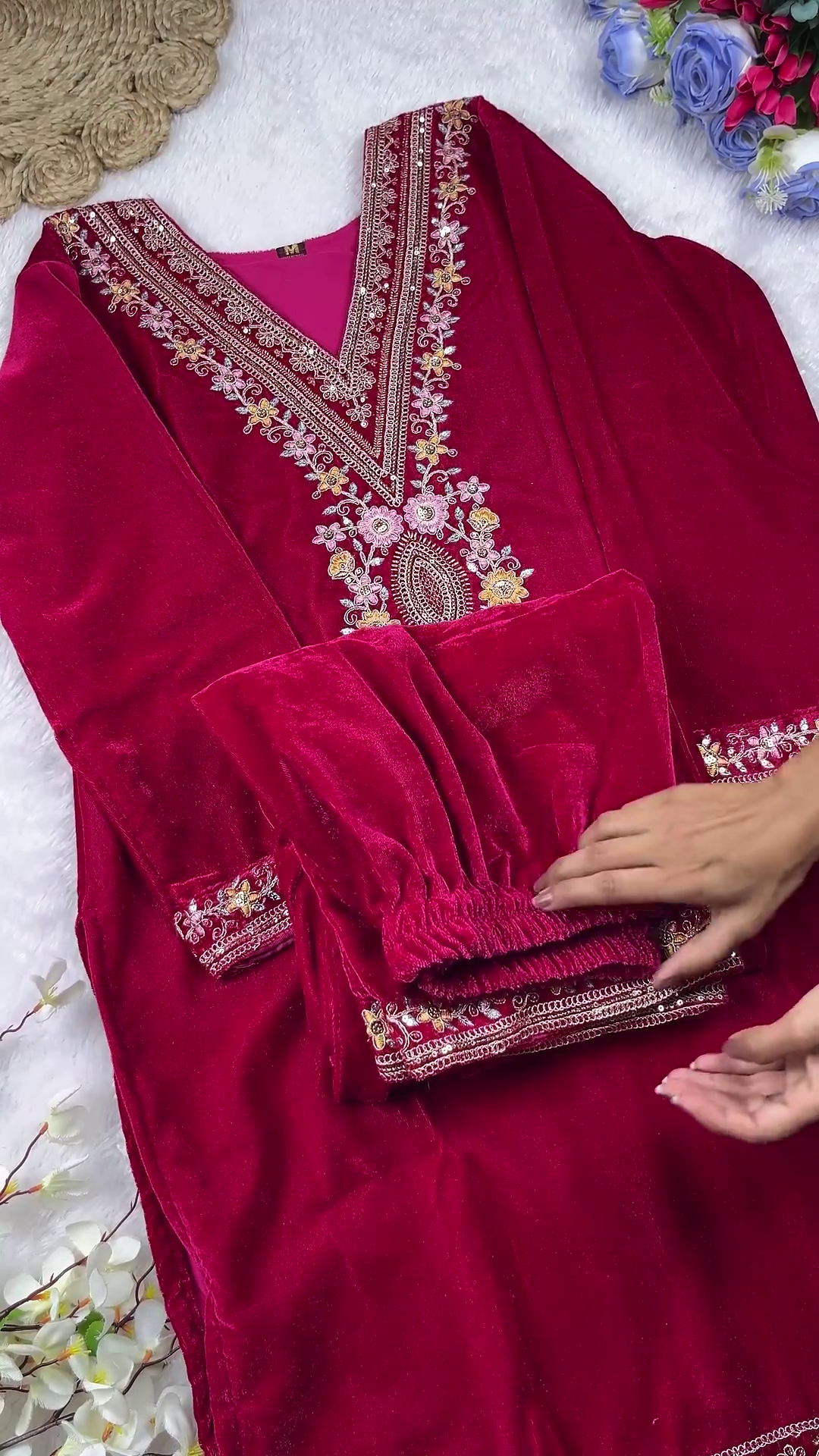 | Bottom Style | Matching Velvet Pants with Ankle Embroidery |
