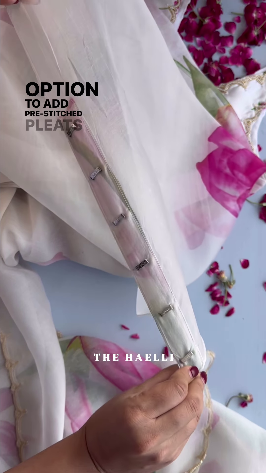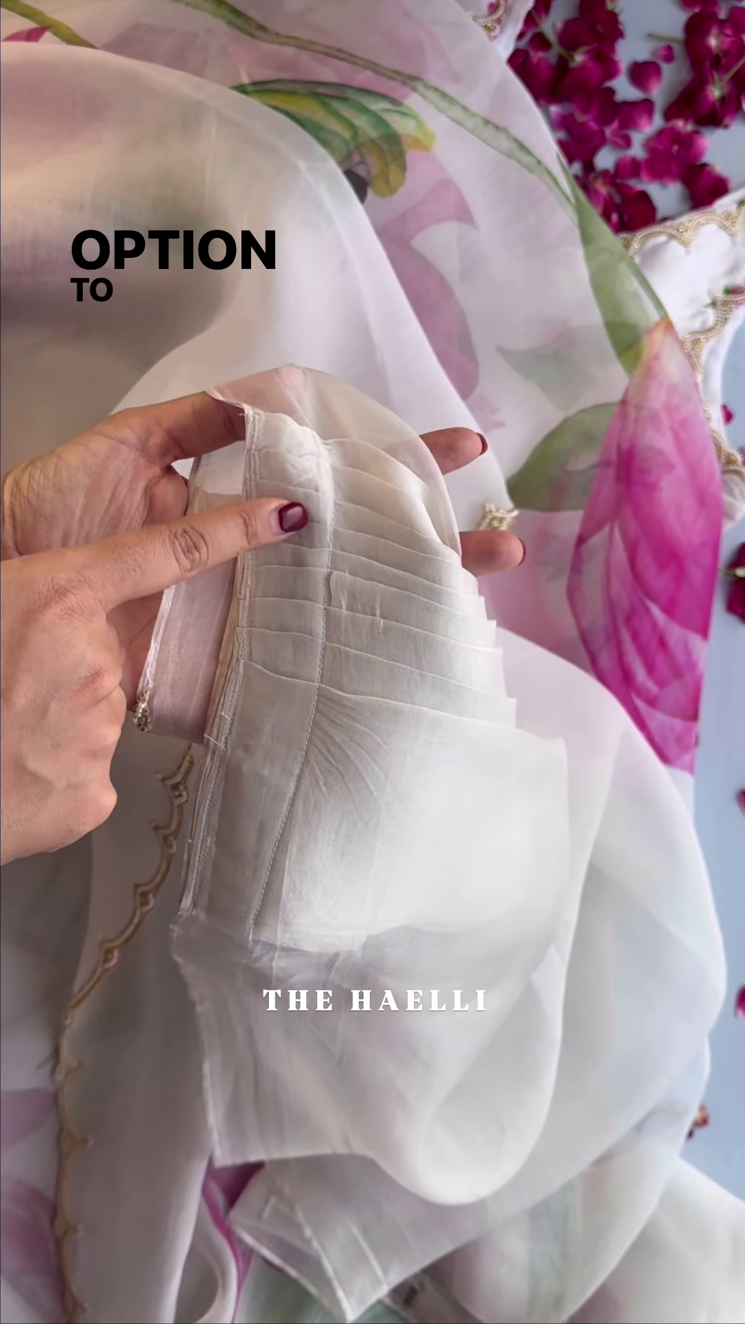 To elevate the luxury of this piece, the entire length of the saree is finished with a stunning scalloped border. This border is meticulously detailed with fine golden thread-work and genuine-looking white pearls (Moti) hand-stitched along the wavy edges. This intricate border provides a subtle weight to the lightweight organza, helping the saree sit perfectly on the shoulder. The combination of the modern organza texture with the traditional pearl finish creates a vintage-meets-modern aesthetic.